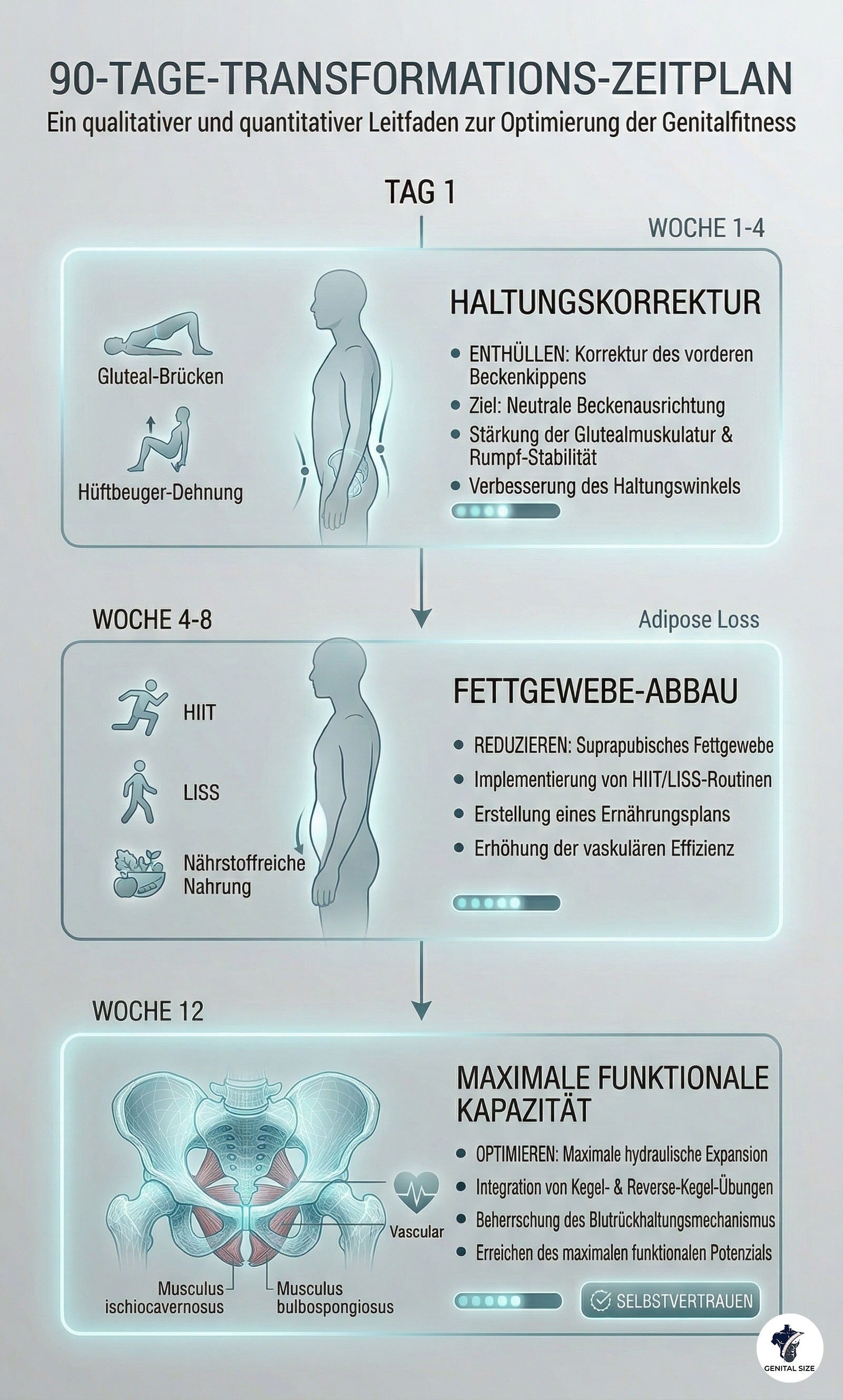 Strategischer Überblick: Dieser Plan detailliert den biologischen Zeitrahmen, der erforderlich ist, um die Beckenkippung zu korrigieren, suprapubisches Fettgewebe zu reduzieren und die hydraulische Expansion für maximale funktionale Kapazität zu maximieren.
